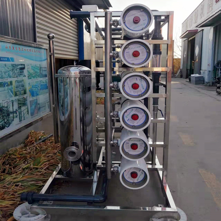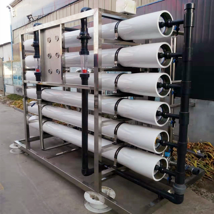 反渗透设备的性能:反渗透是一种借助于选择透过(半透过)性膜的功能以压力为推动力的膜分离技术,当系统中所加的压力大于进水溶液渗透压时,水分子不断地透过膜,然后在一端流出水中的杂质,如离子、有机物等,被截留在膜的进水侧,然后在浓水出水端流出,从而达到分离净化目的。